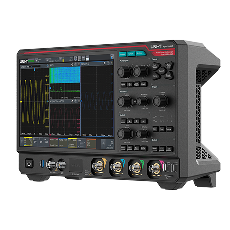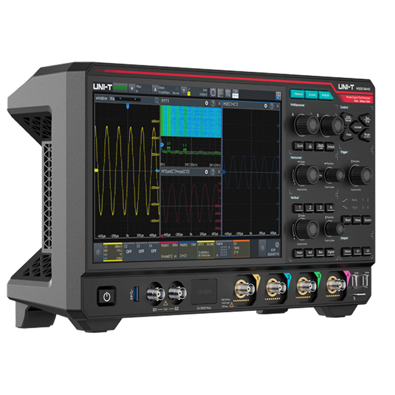 UNI-T MSO5034HD to wysokorozdzielczy oscyloskop sygnałów mieszanych (MSO), oferujący wyjątkową precyzję pomiaru i wszechstronność dla profesjonalistów wymagających zaawansowanej analizy sygnałów. Dysponując potężną pasmem 350MHz (z możliwością uaktualnienia do 1 GHz), szybkością próbkowania w czasie rzeczywistym 5GSa/s oraz wiodącą w branży 12-bitową rozdzielczością pionową, ten instrument zapewnia klarowność i szczegółowość niezbędną w nowoczesnych, złożonych projektach elektronicznych. Dzięki innowacyjnej technologii Ultra Phosphor 3.0, osiągającej imponującą szybkość przechwytywania 1 500 000 wfms/s i 256 poziomów gradacji kolorów, MSO5034HD z łatwością wykrywa ulotne anomalie sygnału, które inne oscyloskopy mogłyby przeoczyć.